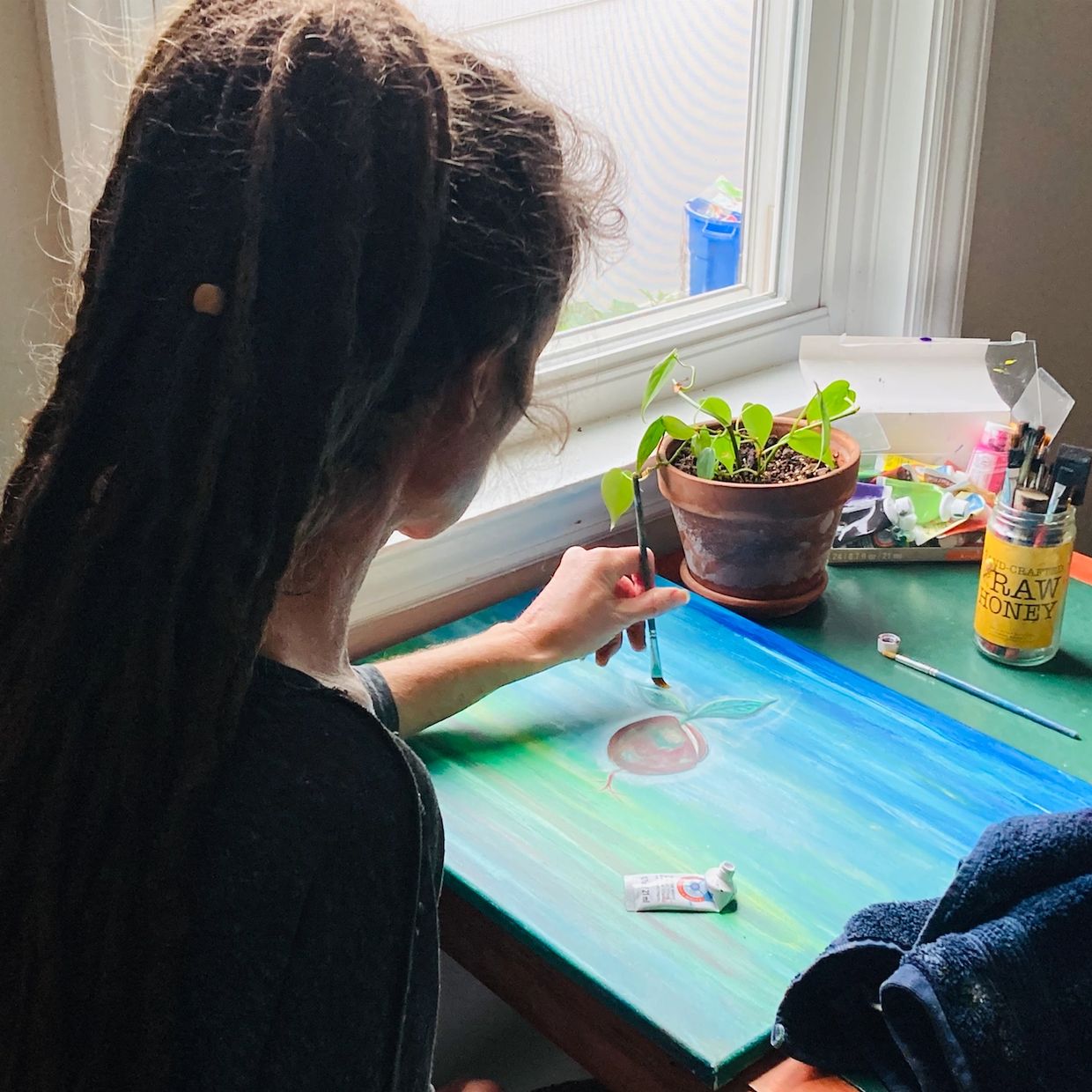 THE ART: I (Emily) painted the cover art! I finished a whole other canvas that featured a seed surrounded by an intricate, colorful mandala. We both love that first painting, which is now displayed in our sacred altar room. But Jason pointed out to me that the art for this album deserves simplicity. A simple seed. A sprout. A single root. Two basic colors. I thought about it, and realized I fully agreed. I pulled out another canvas and began again.